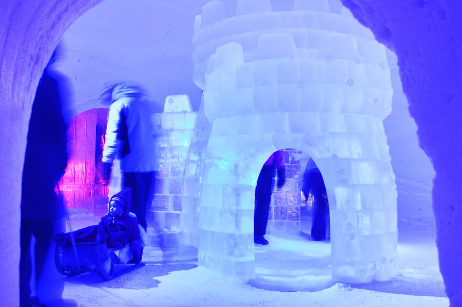 Upeiden jää- ja lumirakenteiden sisällä voit viettää yön lumisviitissä, illallistaa jääravintolassa, nauttia drinkeistä, jotka tarjoillaan jäälasista tai vain kuljeskella lumisia käytäviä pitkin ihastellen jäätaidettamme